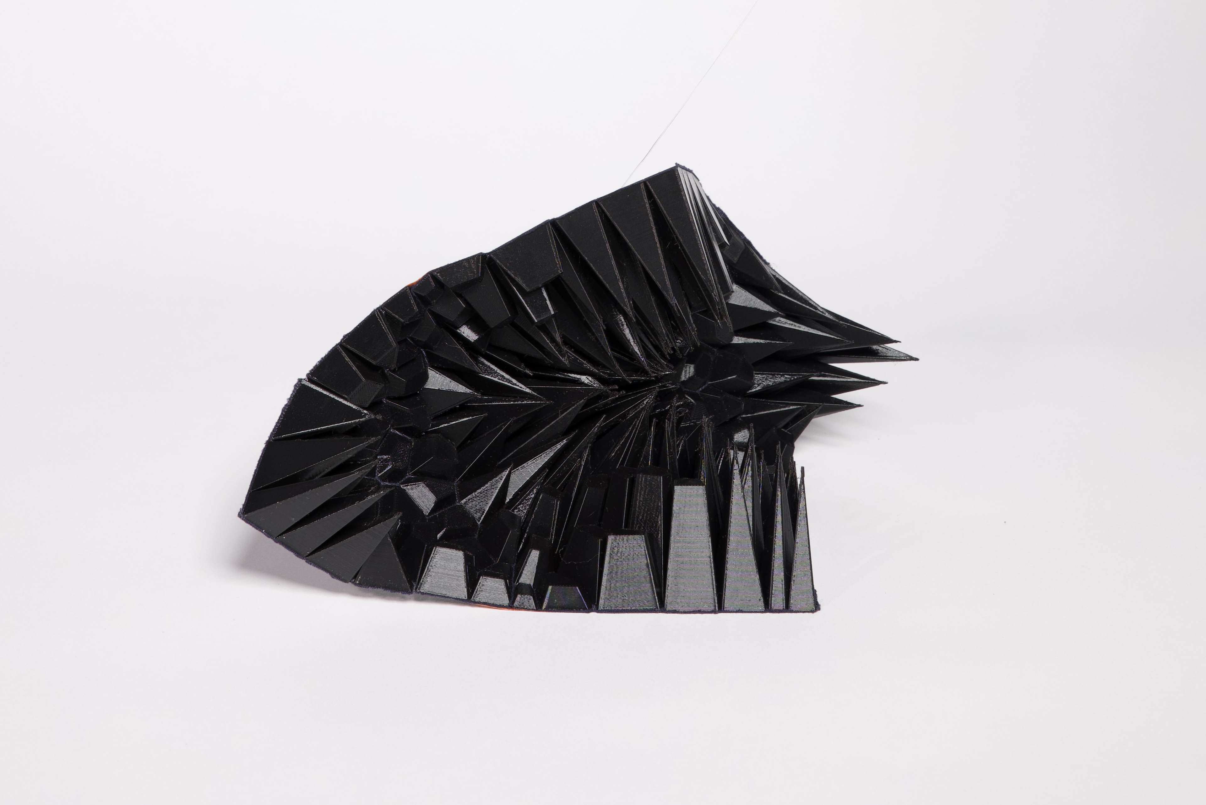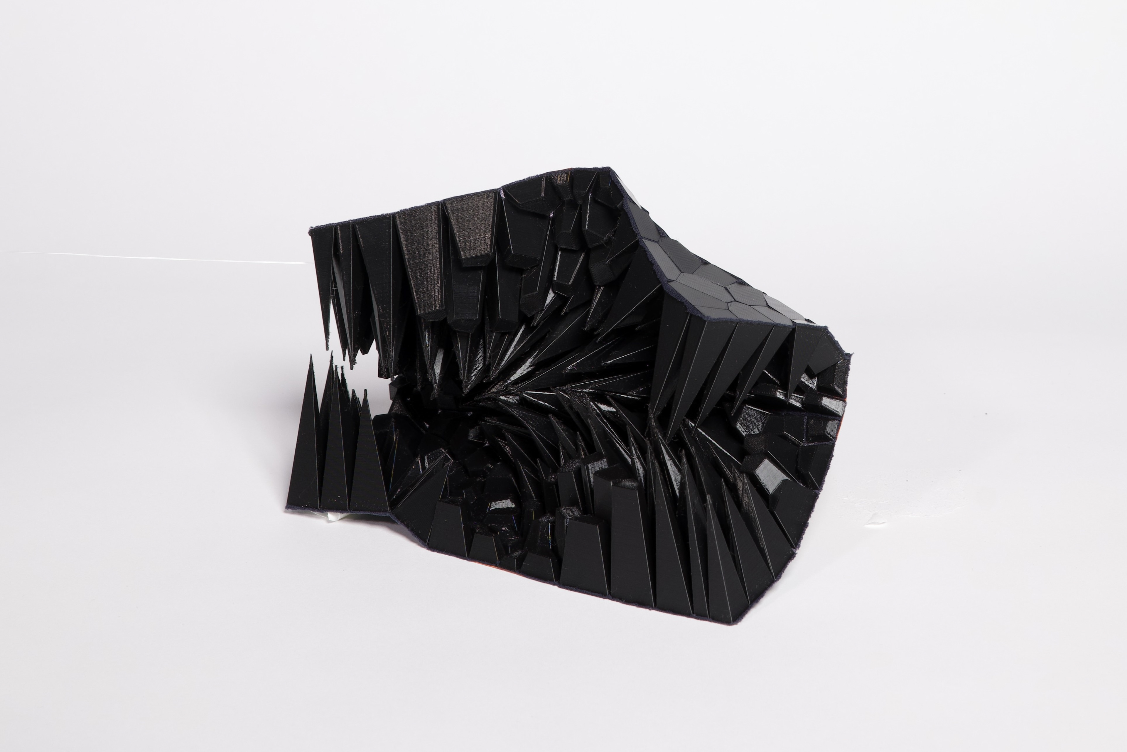 Die Formstudie "Ext-Textile" umfasst eine extrudierte Ausarbeitung der Formstudie "Second Skin". Die Experimente belaufen sich auf stilistische Formgebungen.